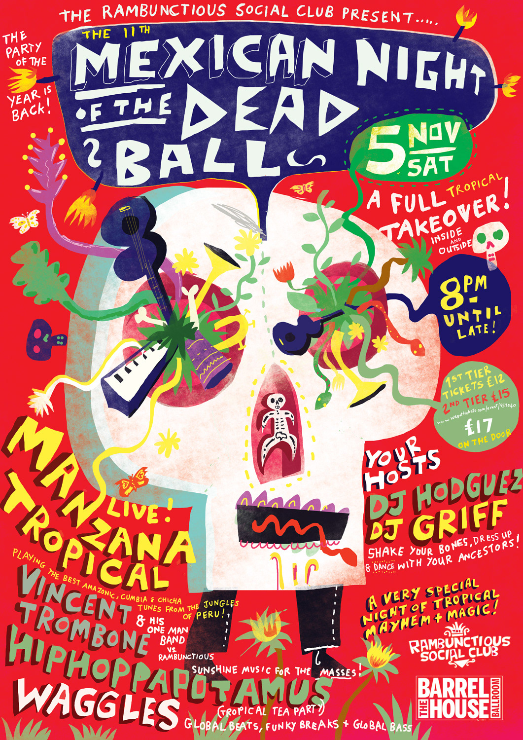 A bone shaking Bonanza! The Rambunctious Social Club brings you the exuberant Dia de los Muertos, a Mexican day of the dead celebration. We smile and Grin with our dead, we welcome them back and we dance! The party of the year is back with a full building takeover, inside and outside of the Barrel House ballroom and Totnes brewery, upstairs and downstairs!